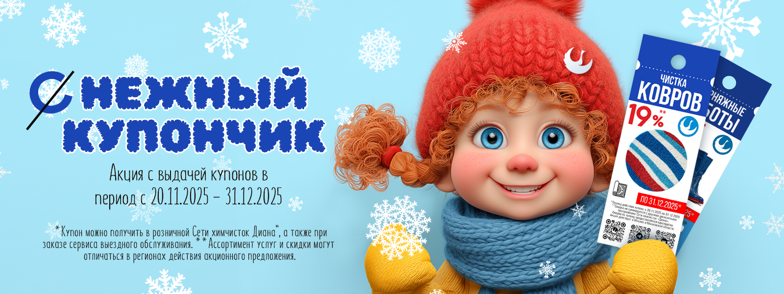 Территория действия Акции: в розничной сети химчисток «Диана» и при заказе услуг на выезде в г. Москва, Московской области и регионах присутствия Сети.