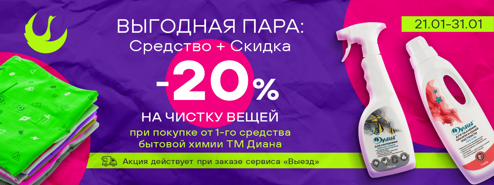 Главное условие Акции: скидка 20% на заказ химчистки изделий на выезде при покупке любого средства бытовой химии ТМ Диана